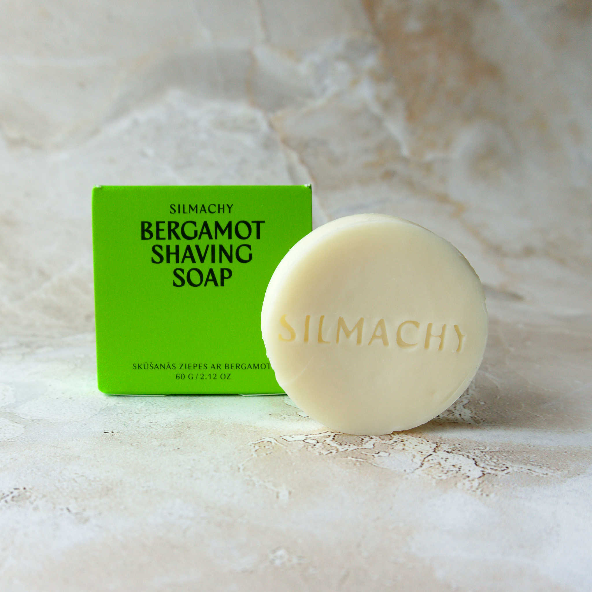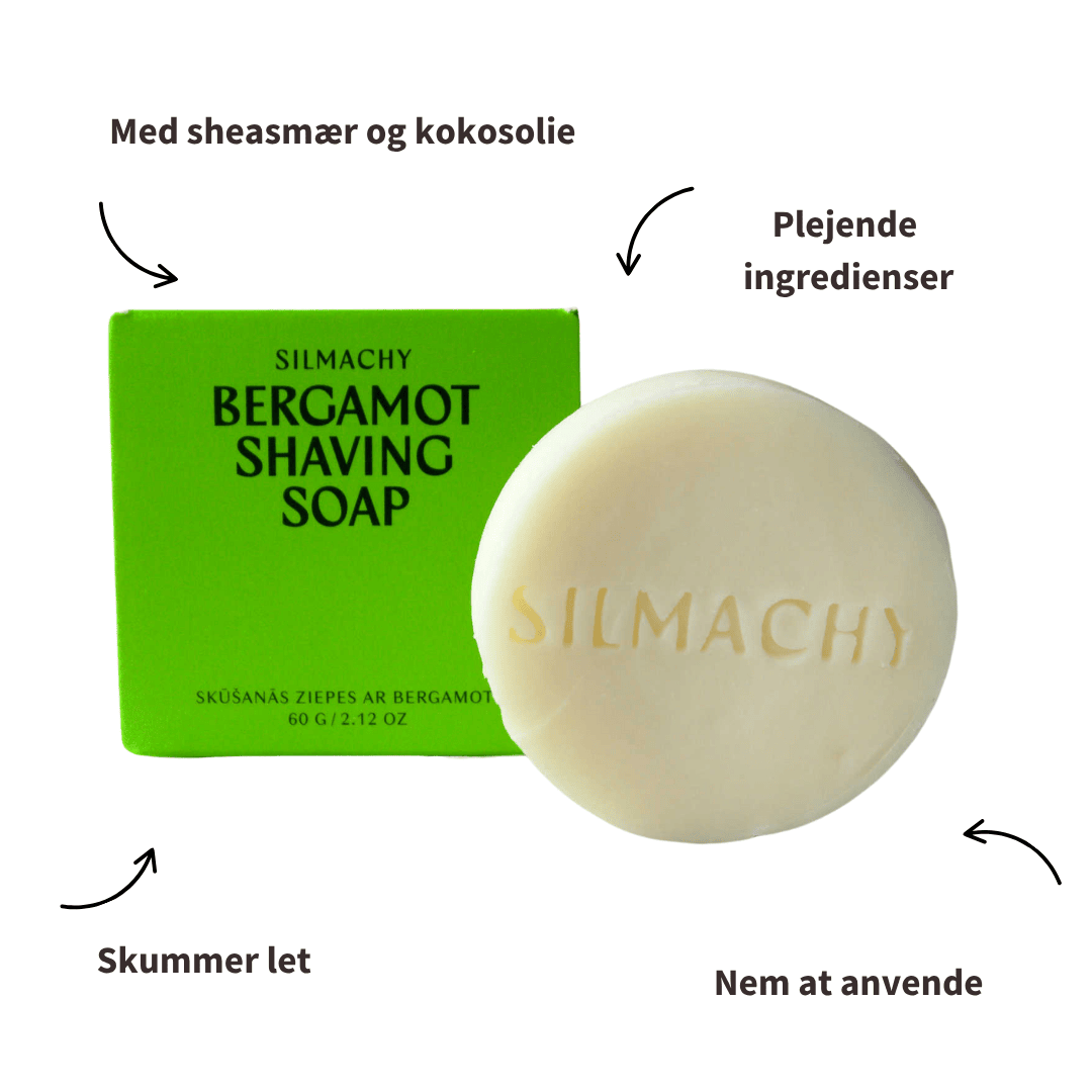 Barbersæben giver et blødt skum med frisk duft af bergamot og plejer huden med sheasmør og kokosolie.