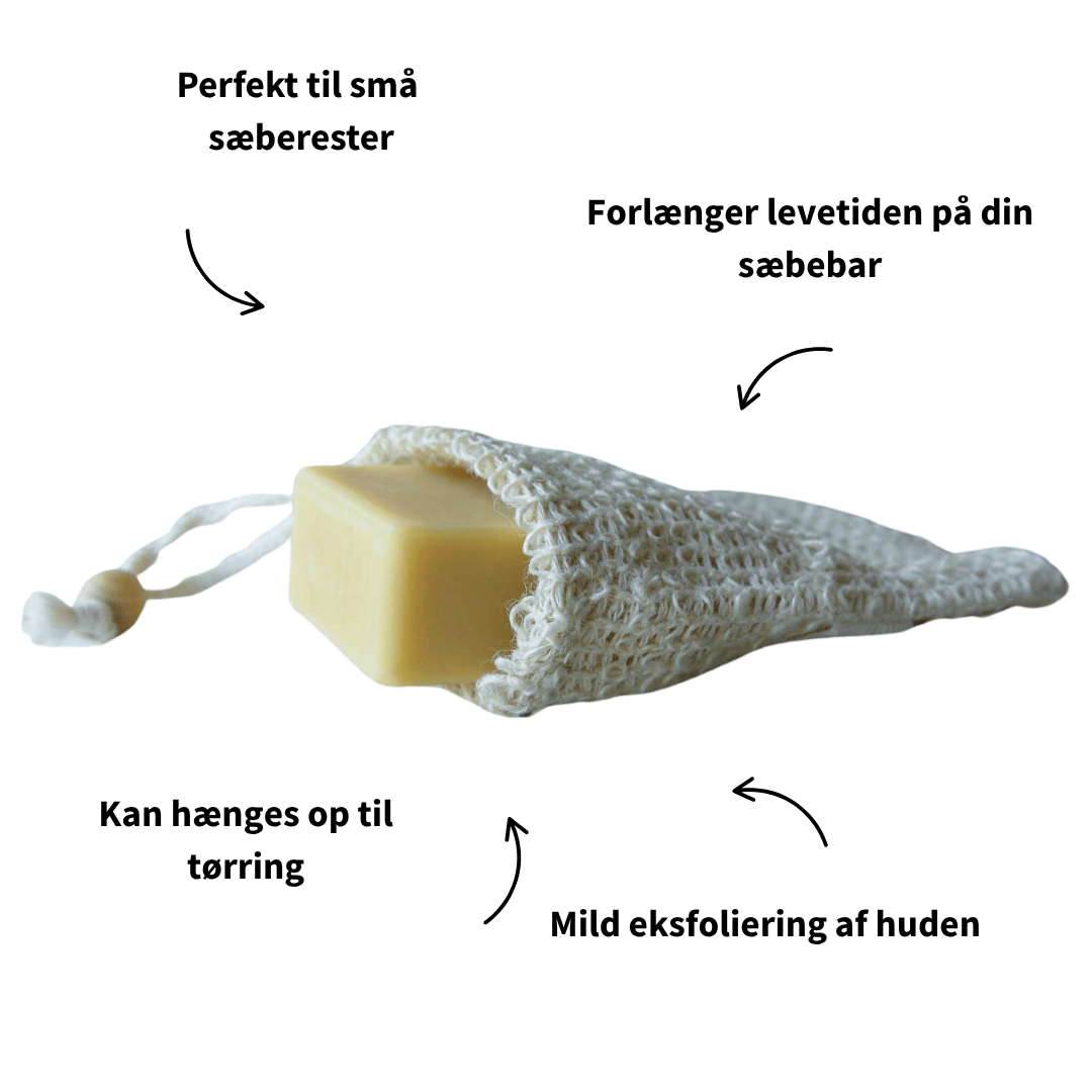 Sæbeposen hjælper din sæbebar med at tørre mellem brug og minimerer spild – perfekt til både hele sæber og små rester. Den giver et blødt skum og mild eksfoliering, og du kan hænge den op i snoren, så sæben holder længere. NB. kommer uden sæbebar