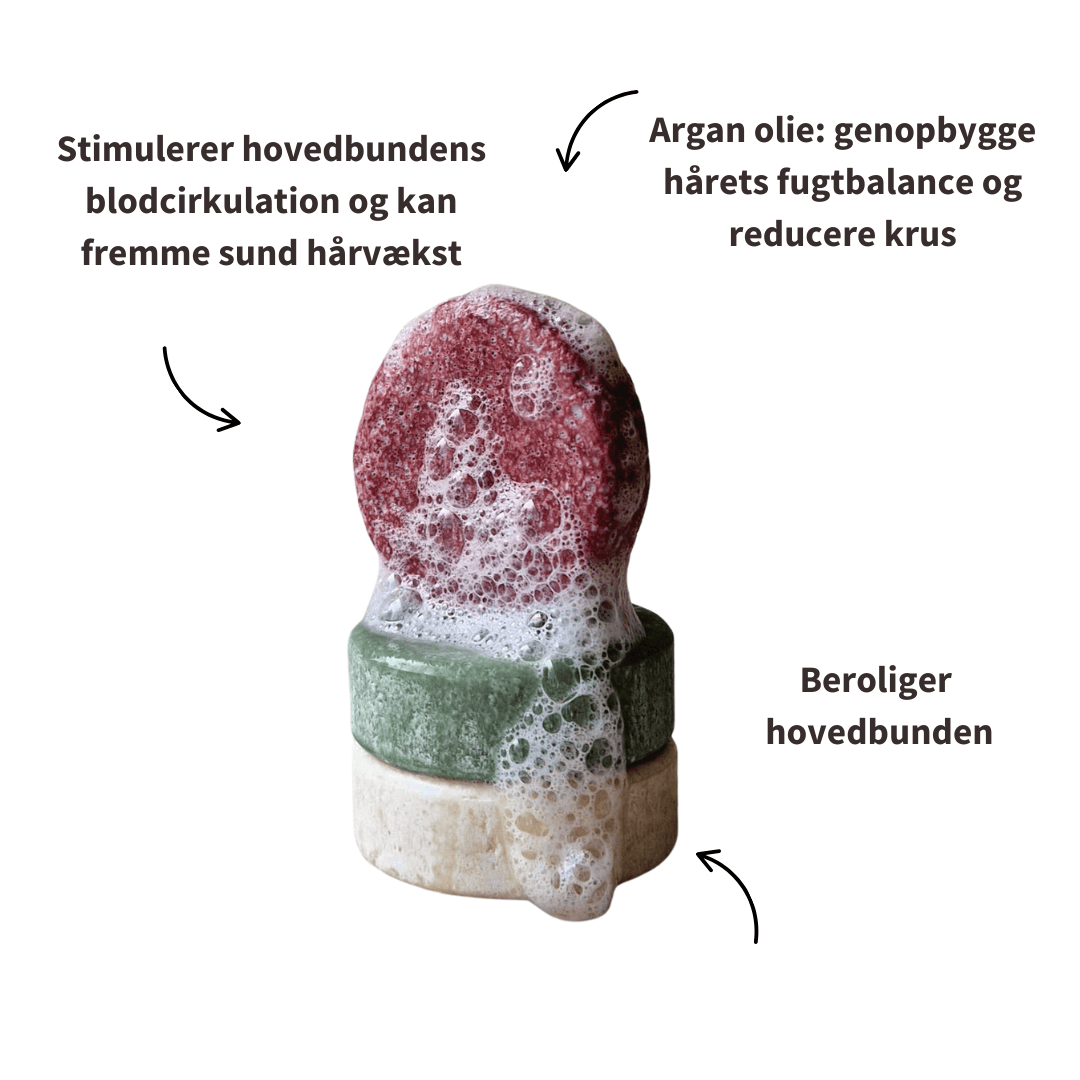 Shampoo bar til normalt og tørt hår. Plejer og fugter tørt hår med en nærende blanding af arganolie, sheasmør, og kokosolie
